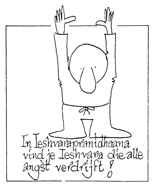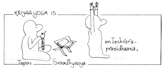 Dit is een omschrijving van leshvarapranidhaana, letterlijk: zich te midden van Ieshvara of God plaatsen. Een van de grote kwalen van onze tijd is cynisme. Dit cynisme, deze ontluistering, ontstaat uit materialisme en uit een gevoel van dualiteit. Je staat te midden van de onmetelijke natuur als een kleine mens. Je voelt je de speelbal. Je voelt je volstrekt hulpeloos, hulpeloos als een worm. Dit heeft een verpletterende invloed. Als je enkele boeken van Westerse filosofen leest, word je een agnosticus of een atheïst. Het wordt hoog tijd dat je de wijzen uit het Oosten bestudeert. Als je enkele van hun boeken leest, word je zelf een wijs mens. Ze geven je een totaal andere kijk op de dingen en op jezelf. Je ontdekt dat er absoluut geen basis is voor cynisme, bitterheid, wanhoop, angst. Patanjali, de grondlegger van de klassieke Yogafilosofie, schrijft in zijn Yoga Soetra (I11): "Tapas, Svaadhyaaya en Ieshvarapranidhaana vormen samen Kriyaa Yoga." In deze betekenis kun je Kriyaa Yoga begrijpen als de Yoga van het dagelijks leven. Kriyaa is afgeleid van dezelfde wortel als Karma en betekent: handeling. Kriyaa Yoga geeft je de hoogste vruchten van Yoga, zegt Patanjali. Wat zijn die drie bestanddelen van Kriyaa Yoga, die je een plaats moet geven in je dagelijks leven? Het eerste is Tapas, versterving. Het tweede is Svaadhyaaya of studie van de Schriften of boeken van wijsheid. Het derde is leshvarapranidhaana. Tapas betekent: niet mopperen, niet kankeren, tegenslagen en moeilijkheden niet uit de weg gaan, maar ze met de glimlach nemen, het beoefenen van zelfbeheersing. Het betekent: een controle behouden en niet het slachtoffer worden van allerlei zelfgeschapen behoeften en grillen.