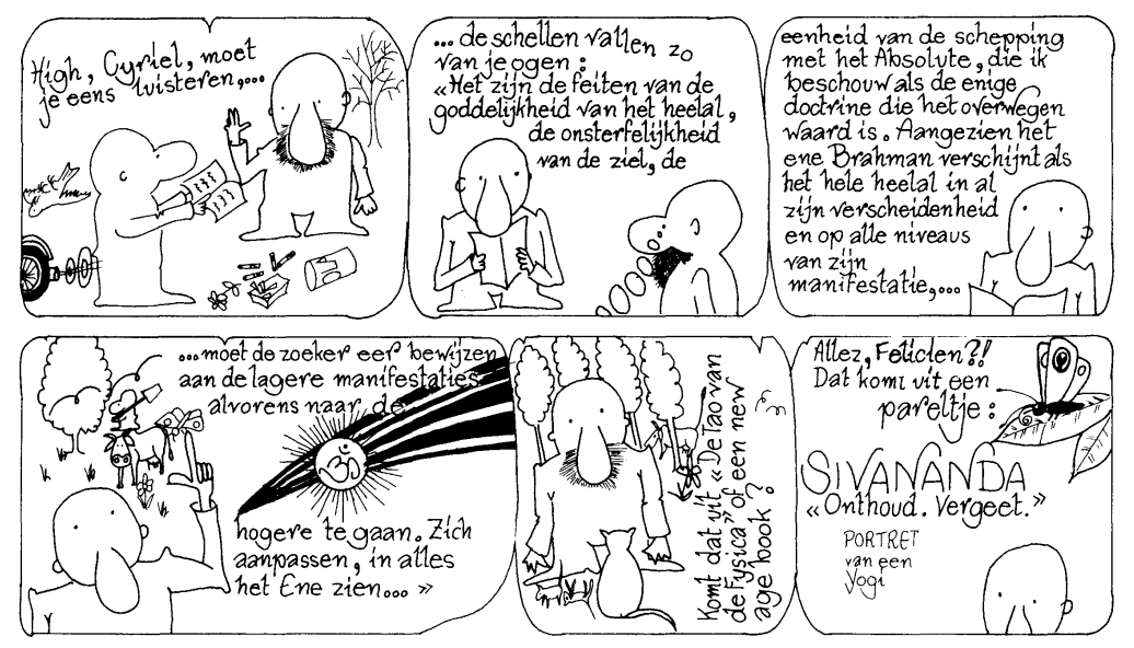 Misschien denk je: "Dit is niet voor mij. Ik sta er ver af." Daarin vergis je je toch. Ook al sta je nog nergens op het Yogapad, toch is dit ook iets voor jou! Er is een simpel geheim. Zet, telkens je er aan denkt -en in de eerste plaats tijdens je oefening, want als je er dan niet toe komt, zul je er op andere ogenblikken zeker niet toe komen!-, in gedachten een stap achteruit en rust in jezelf als de Getuige van dit vergankelijk lichaam en deze rusteloze geest. Laat hen aan henzelf over. En rust jij volmaakt in jezelf! Je lichaam en je geest zijn geprogrammeerd en geconditioneerd op allerlei manieren. Ze ontwikkelen allerlei mechanismen, reacties enz. Wees je er bewust van als een Getuige. Vereenzelvig je er niet mee. Dit kan nooit genoeg worden herhaald en beoefend. Als we duizend frank kregen voor elke keer dat Shiva en ik dit zeiden en schreven, dan konden we gemakkelijk een Aashram bouwen. En nog iets van kapitaal belang: D. H. N.: Doe Het Nu! Stel het niet uit tot morgen, want die morgen komt nooit! Wie veel weet en het niet beoefent is als een ezel met een lading boeken op zijn rug, zei Boeddha. Of zoals Goeroedev zei: "A loof in Shirshaasana, Een keg in Kopstand."
